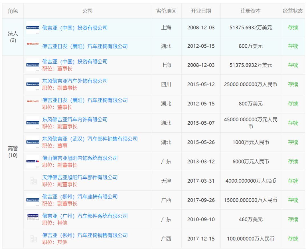 求是汽车查询得知,Francois TARDIF(中文名为“唐德福”)在国内担任法人代表的企业仅有2家,分别是佛吉亚(中国)投资有限公司(以下简称佛吉亚中国)和佛吉亚日发(襄阳)汽车座椅有限公司。前者是法国零部件巨头佛吉亚在中国设立的运营主体,后者是前者与日发投资有限公司合资成立的控股子公司。
