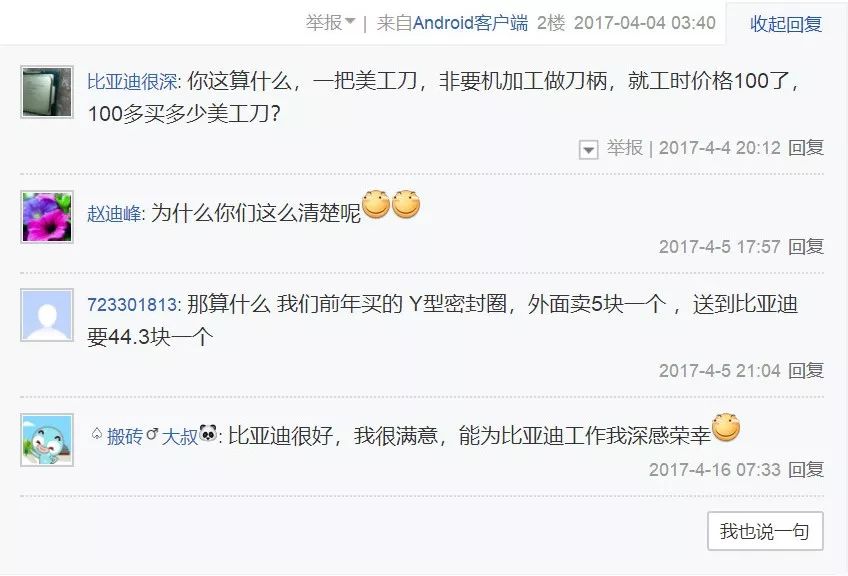 由此导致的成本高企,也成为比亚迪无法解决的问题。在百度贴吧上有网友爆料称,一把美工刀,仅加工刀柄的工时价格就需要100元,一个售价5元的Y型密封圈,送到比亚迪需要44.3元。