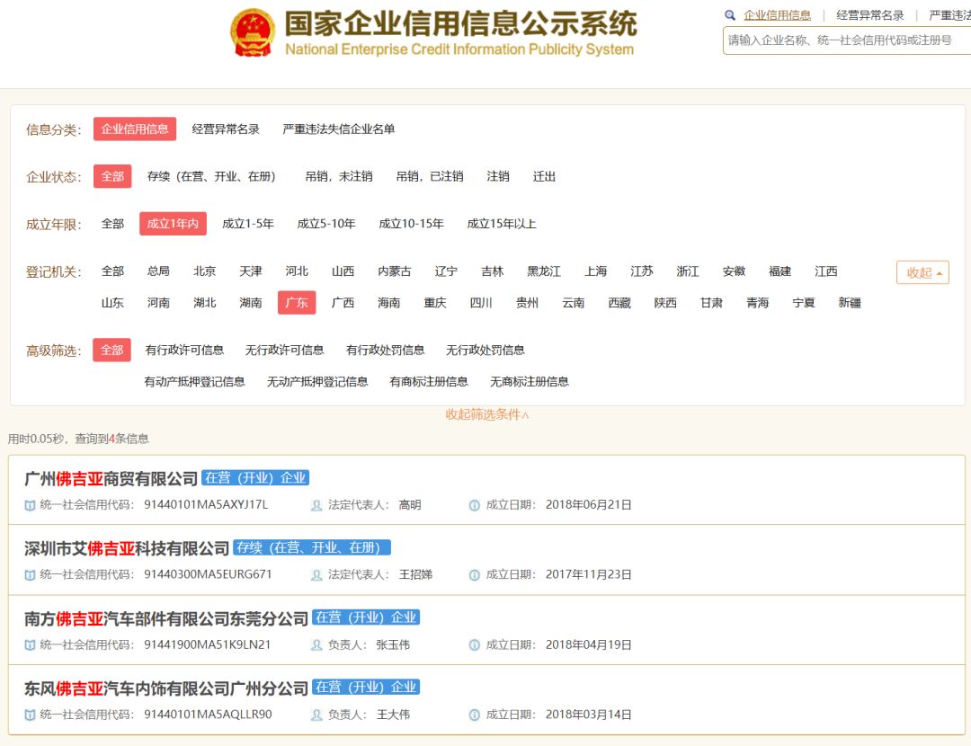近一年于广东地区注册成立的企业,没有“深圳佛吉亚汽车部件有限公司”